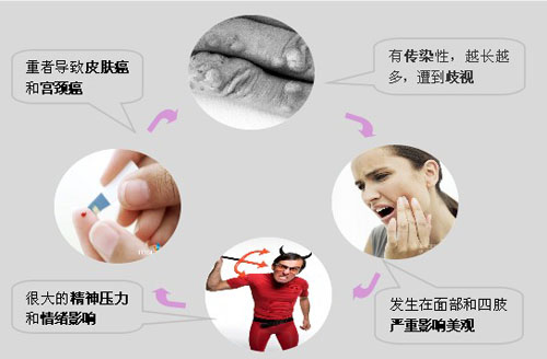 扁平疣不但影响面部美观而且具有传染性,给人造成很大精神压力和情绪影响,它的易传染性造成家人之间产生隔阂,其更大的危害是HPV病毒可致女性发生宫颈癌。